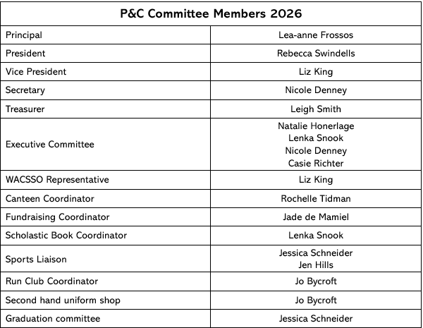 The P&C Annual General Meeting is held on Tuesday, Week 2 of Term 1 each year. All positions are to be nominated for. Most of the roles are not onerous and the P&C committee will provide new members with support to settle in and develop their new role. P&C membership is $1.00 which gives you the right to vote in all P&C decisions.