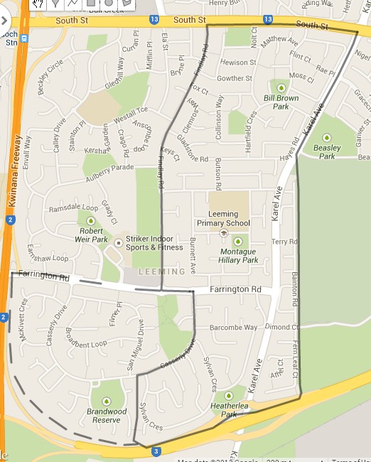 Intake Area Leeming Primary school intake boundaries are within the unbroken lines. Broken lines indicate an optional intake area. Students in this area may enrol in either Leeming or West Leeming Primary Schools.